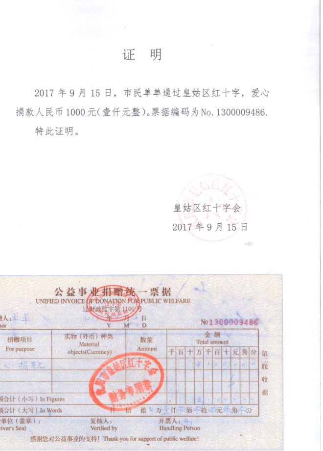1红十字会捐赠1000元(单单)