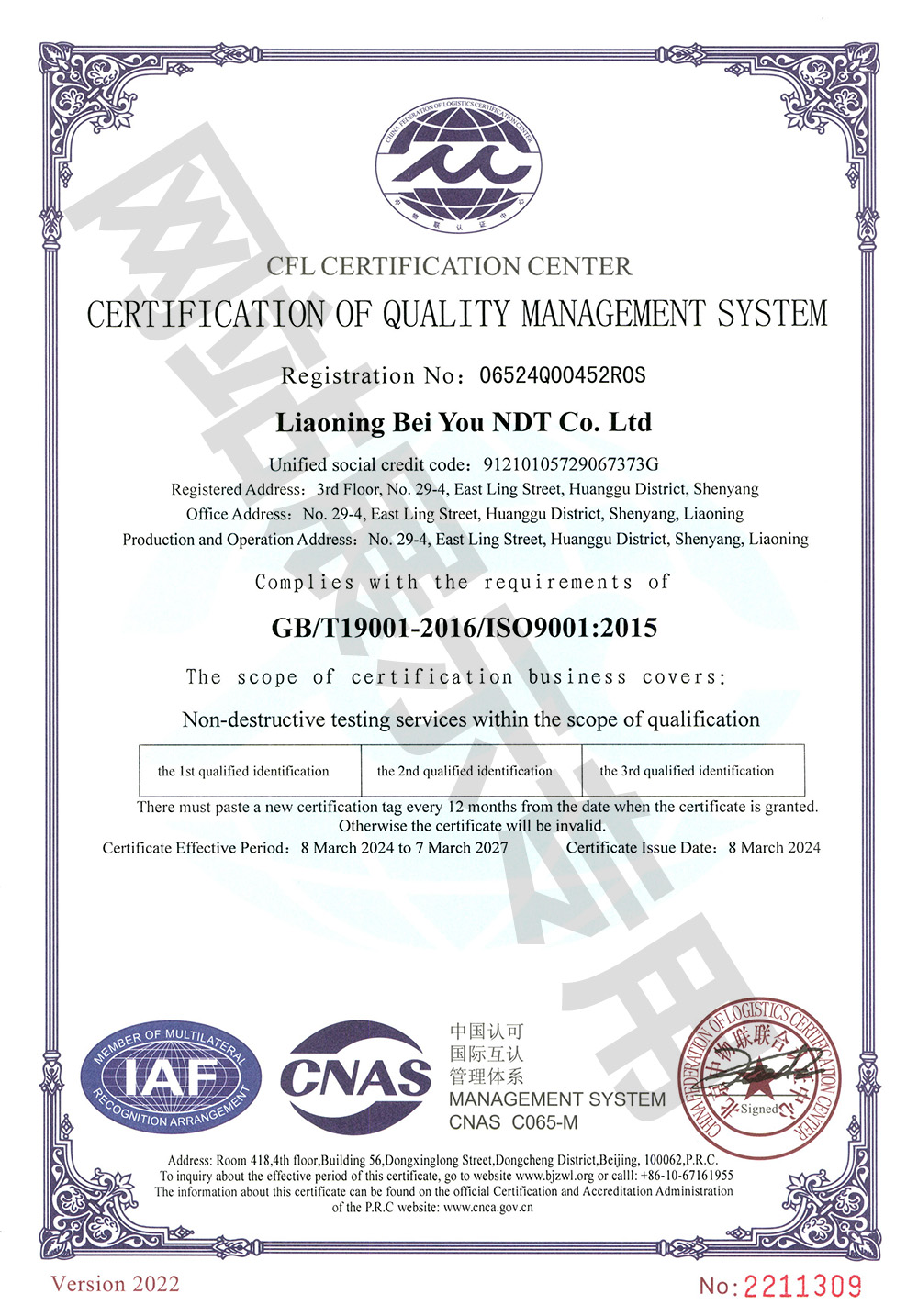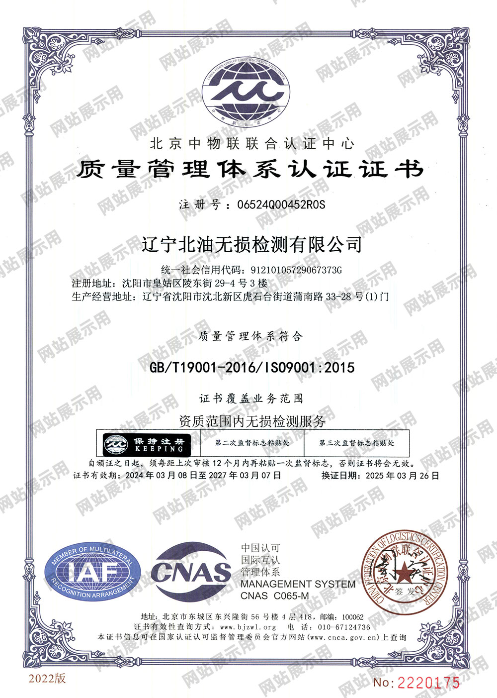 质量曾理体系认证证书
