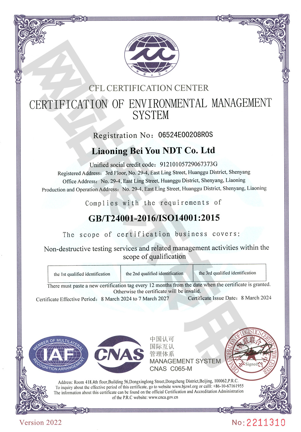 环境管理体系认证证书 英文
