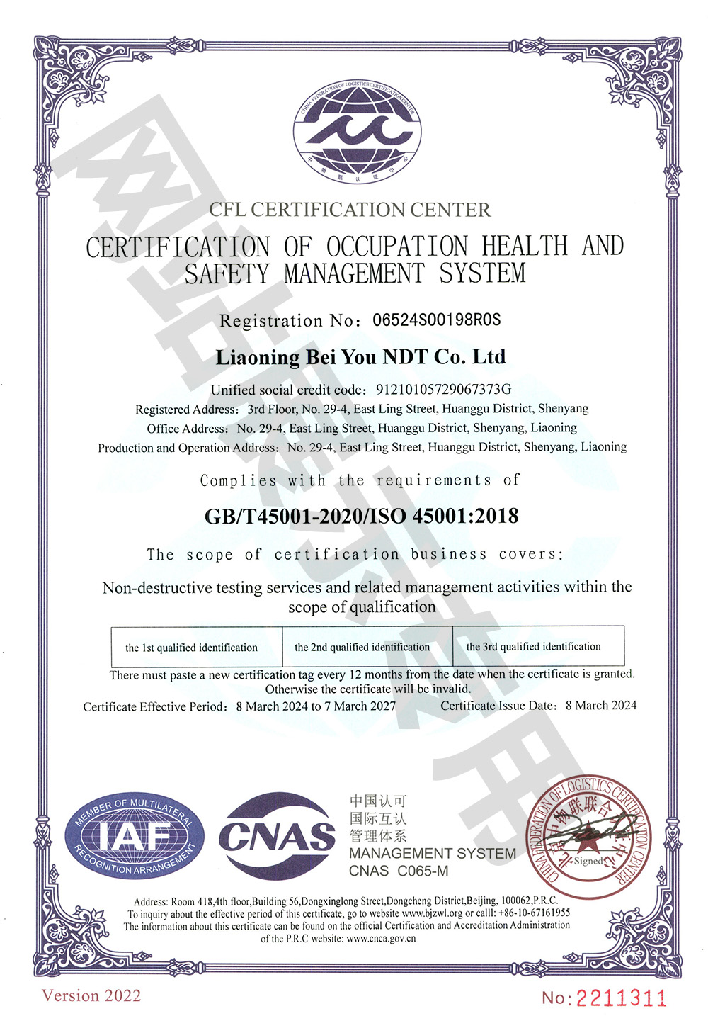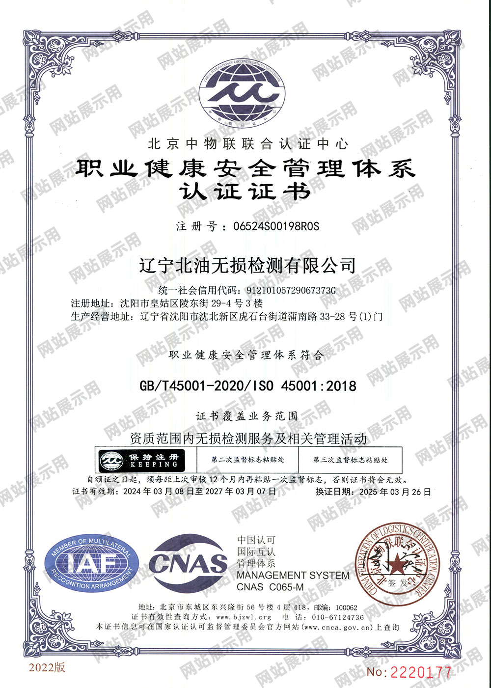 职业健康安全管理体系认证证书