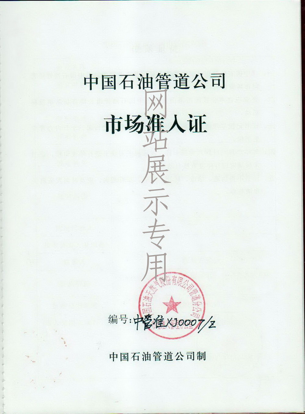 中石油西部管道公司市场准入证