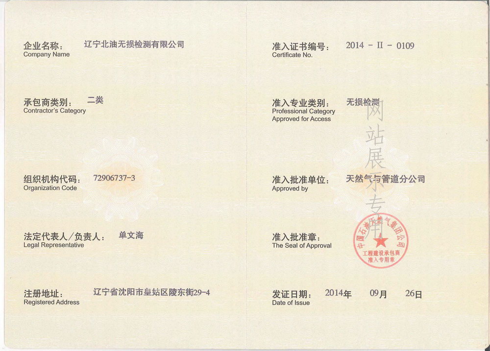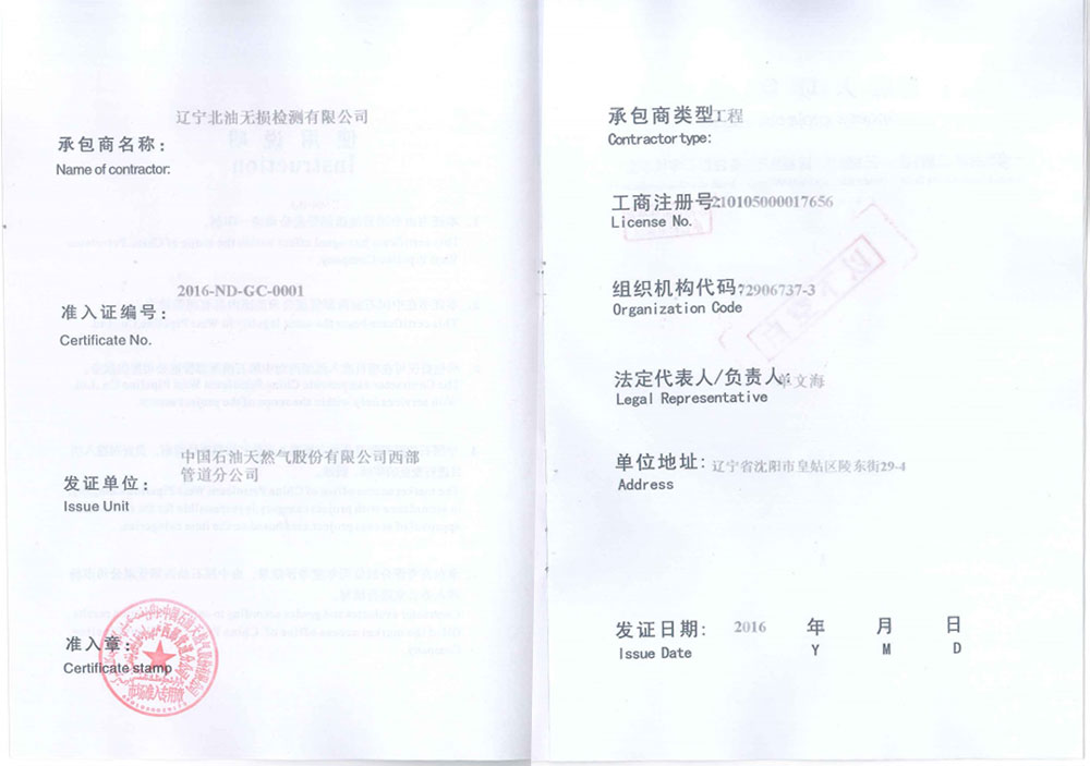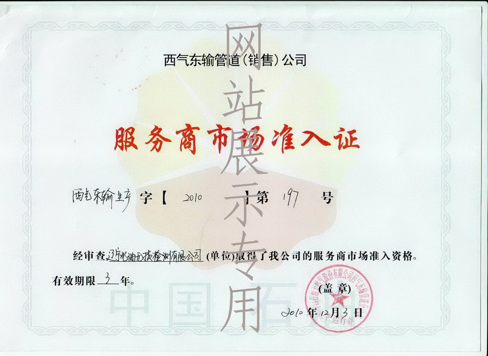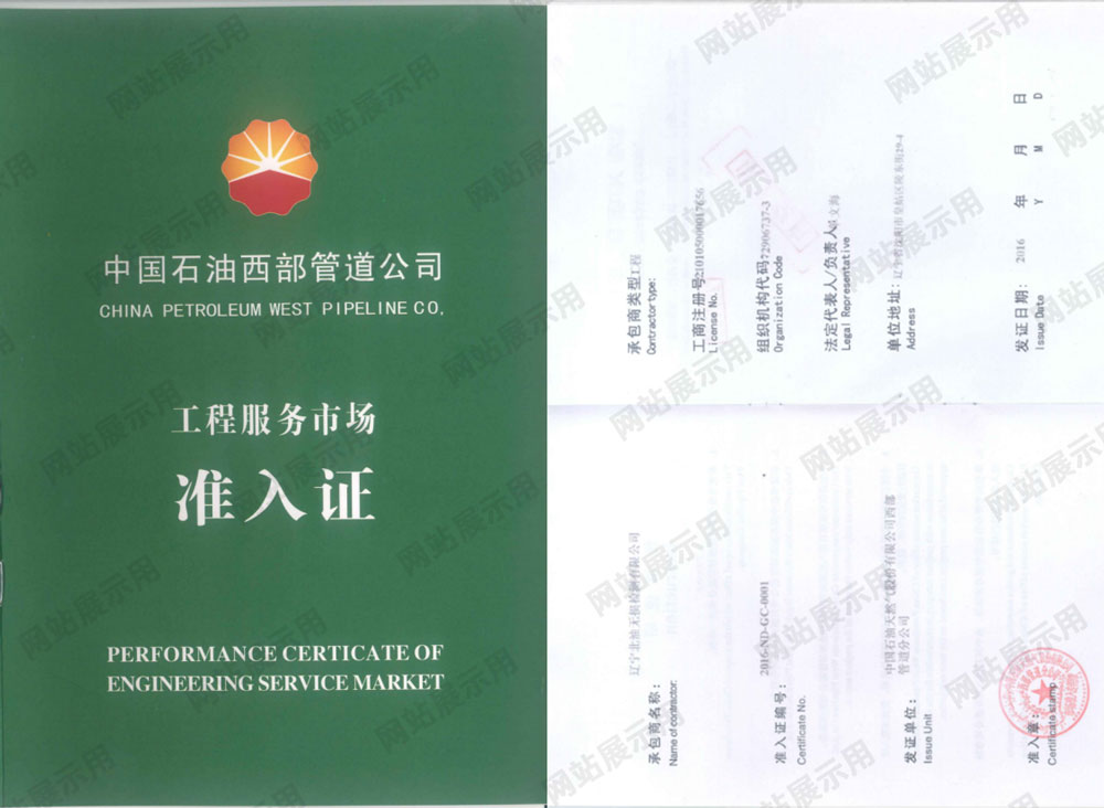 中国石油西部管道公司工程服务市场准入证