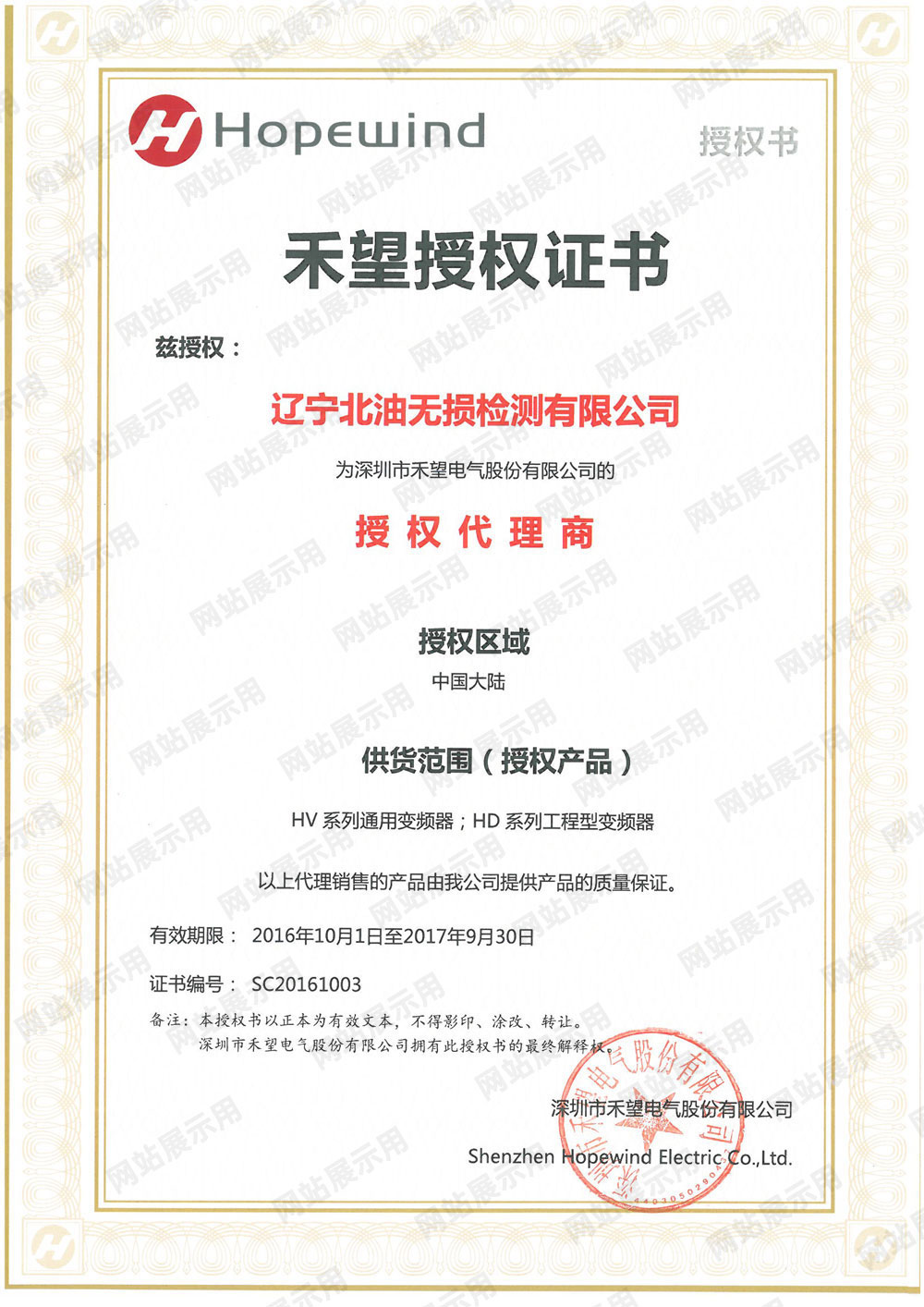 禾望授权代理证书
