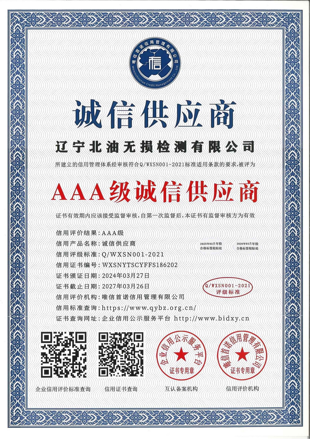 诚信供应商等级证书
