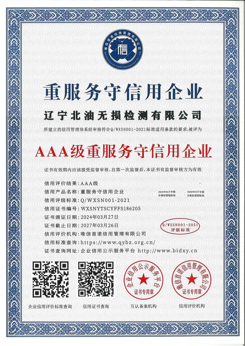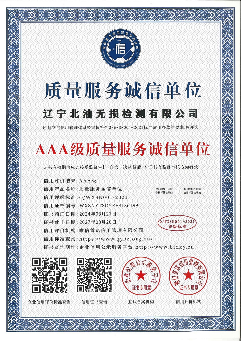质量服务诚信单位等级证书