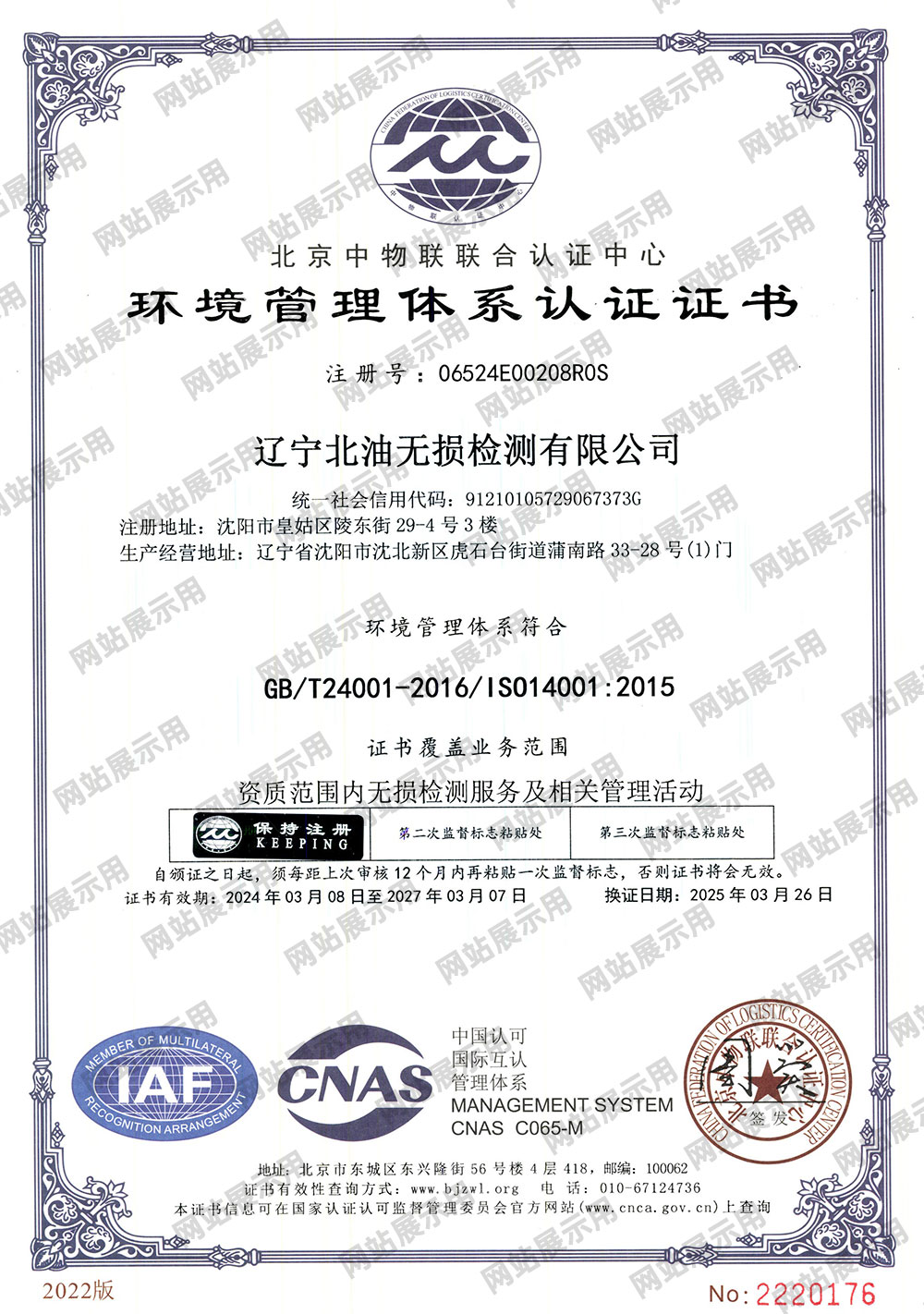 环境管理体系认证证书