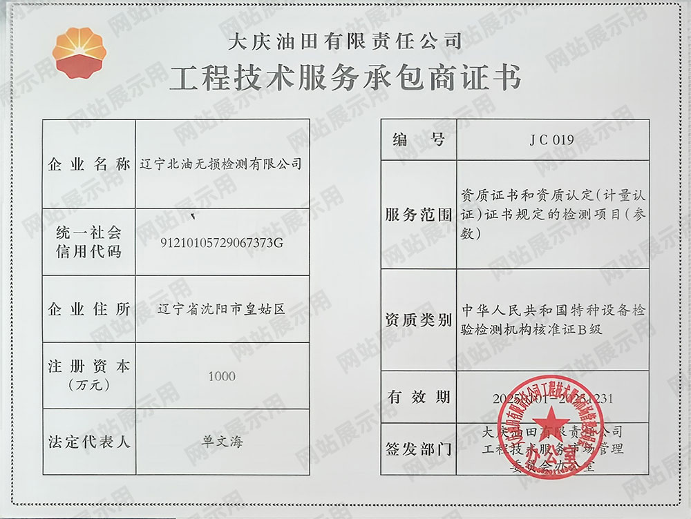 大庆油田工程技术服务承包商证书